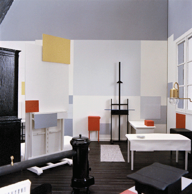 De 1913 date la première toile totalement géométrique, carrés jetés sur fond blanc : l'abstraction* a fait place à la non-figuration* ; dans Façade bleue, composition 9, (1913-1914, MoMA), on remarque encore dans le bas quatre touches grises non délimitées, Composition n°VI, (1914), Fondation Beyeler). Il va vers plus de rigueur encore, Lozenge with Grey Lines, (1918, HGM), qui anticipe Morellet* et il devient l'inspirateur de toute une lignée, celle du néoplasticisme*. Sa méthode est minutieuse : il réclame à son fournisseur des toiles aux dimensions précises, au millimètre près ; il esquisse en traçant les contours des géométries sur un papier, parfois recto verso, en notant au crayon dans chaque partie, les couleurs à employer. Mais, à l'inverse de son disciple Vantongerloo*, il n'entrera aucune mathématique dans sa création : seule joue l'intuition de l'œil. En 1919, ses damiers sont des rectangles strictement égaux ; désormais il n'emploie plus que des droites, ses tableaux sont orthogonaux ; d'aucun fait penser à un nuancier limité et terne, Composition avec grille, (1919). En 1920, enfin, et encore en 1921, MoMa), il n'use plus que des trois couleurs primaires et des trois non-couleurs, le noir étant principalement destiné aux traits de cloisonnement : l'orthodoxie du néoplasticisme est fixée, il la publie cette année-là.