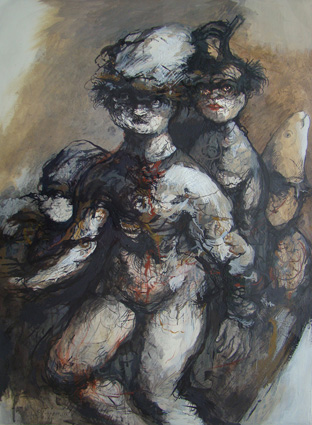 Présentation : Une atmosphère à la Rouault* toute d'ombres tachées çà et là de blanc, balayées de pourpre. À ceci près que le tragique n'y règne pas mais le grotesque. À la gouache et aux boucles répétées, d'encre le plus souvent, à l'huile parfois, un monde rempli d'acteurs, de bouffons, de toute une faune sarcastique lorsque les femmes portent un nez d'oiseau et lorsque les hommes sont issus de Dickens. Tendres monstres dans les ténèbres dont certaine accumulation fait penser à Daumier.