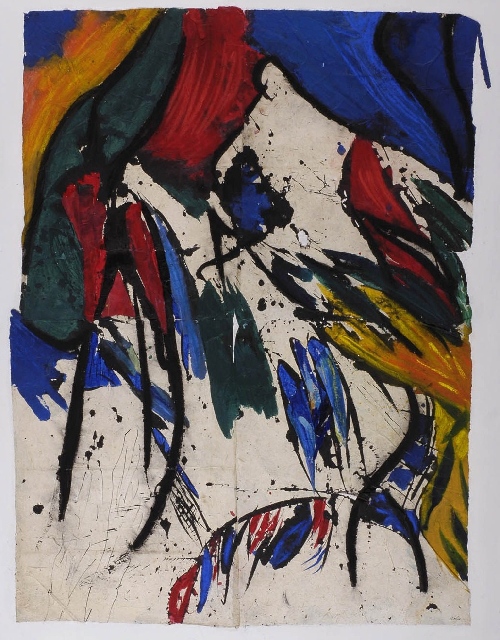 Présentation : Quelques aquarelles au touché léger, allusif de figures (1963) , Au départ, en France, un foisonnement de couleurs à dominante primaires, gerbées comme un Van Gogh. Puis la composition s'aère, des coulures et du dripping* à dominante brune organisent des morphologies blanches qui permettent de lire des corps dressés, Mystères, (1989) et des paysages marins, Le Temps du colza, (1989) .