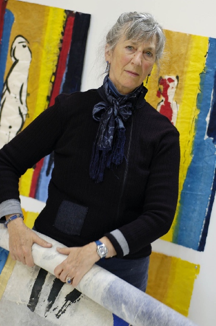 Il y a ses grands formats sur papier népalais qui atteignent plusieurs mètres de haut ; il y a la quasi exclusivité des primaires ; il y a les corps dessiné centre de triptyque interne ; il y a la verticailté de ceux-di comme un effort vers l'au delà. Si ces bannières de 3 m ne sont, selon elle, pas réussies, elle les découpe et les met en réserves ; ces fragments reviendront par collage sur d'autres bannière ou seront un matériau pour les oeuvres de chevalet.