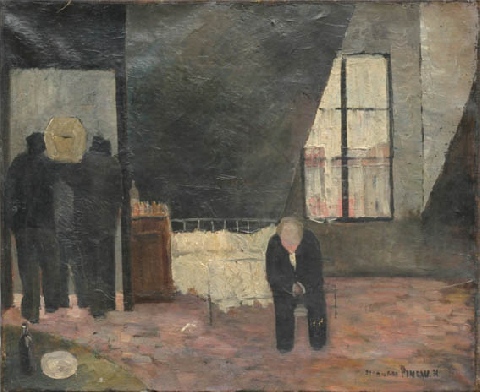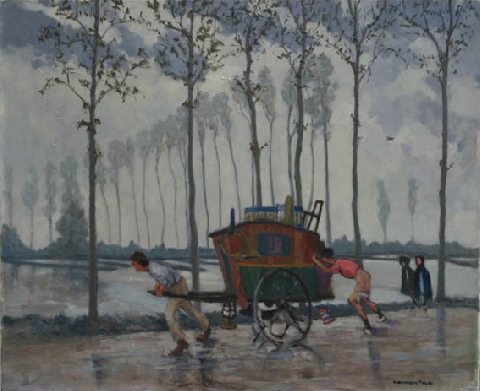 Présentation : Il peint des scènes de genre, construites, colorées, mais non détaillées, à telle enseigne que les visages sont tous à l'aveugle sinon ceux du cirque dont le bariolage facilite la tâche, Family Circus (vers 1950). Vers 1960, il cerne ses figures d'un trait léger Fontaine Sainte-Marie (s.d.). Ponctuellement, il regarde vers le fantastique, Carrousel dans la neige (ca. 1950), de facture noire, vers Utrillo*, mais reprend vite ses images de la vie quotidienne, heureuses à l'exception de Après la bataille (ca. 1932), l'homme prostré de face, tourne le dos au cercueil emporté. Il est aussi paysagiste, Automne à Clamart (s.d.) en plongée aux couleurs rouille accusées. Comme l'auteur de quelques sujets religieux.
