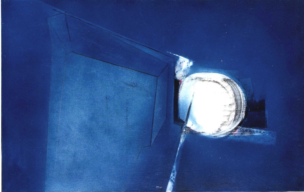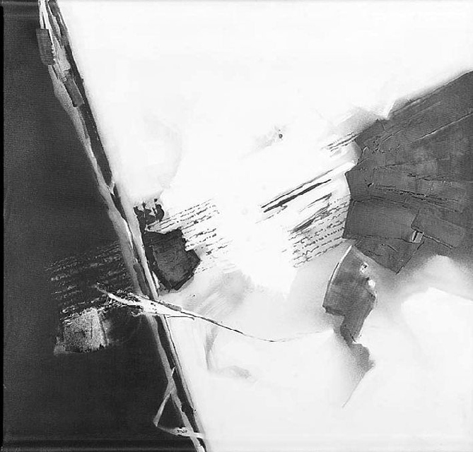 Présentation : De 1958 à 1962, ce sont les derniers signes de la réalité, chosifiée, jusqu'à n'être plus que masses, Les Lampadaires (1958) ou Notre-Dame de Paris (1958). Non-figuratif, il adopte en 1962, un demi-cercle frappant trois planches, rigide malgré de temps à autre des souvenirs de Schneider*. Ce classicisme calme s'agite en 1965, il donne des chutes plumées. Puis, apparaît au centre de ses compositions un cercle globuleux, générateur de lyrisme ; il devient soleil en 1982 dominant une esquisse de paysage. De 1987 à 1988, il s'éloigne à nouveau de toute allusion à la réalité. Une toile de 1991, perce d'une ligne-flèche dans la blanc, un amas de nuage noir réfugié à l'autre bout. A compter de 1989 et jusqu'en 2002, il ne pratique plus que l'acrylique blanc et noir, rarement relevé d'une touche de bleu, de rouge, de beige. C'est une opposition constante entre le lisse et le modulé, l'épaisseur et la transparence, le travail au couteau et celui au pulvérisateur. Des caches permettent la séparation de la force et de la légèreté.