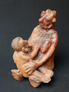 Présentation : Considérée dans son pays comme sorcière, elle modèle des figures en terre, petites ou grandes, toujours difformes, que l'on peut, par facilité occidentale, classer dans l'art brut*, encore que les visages, à défaut de la forme générale, s'inspirent de la tradition africaine. Les difformités, les situations érotiques, les monstruosités font sa particularité fantasmatique.