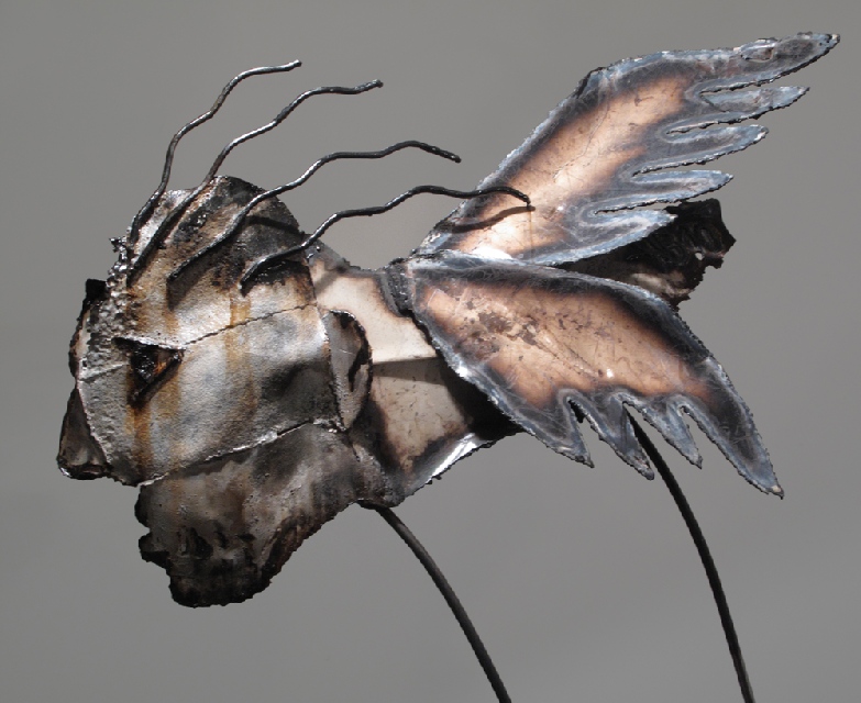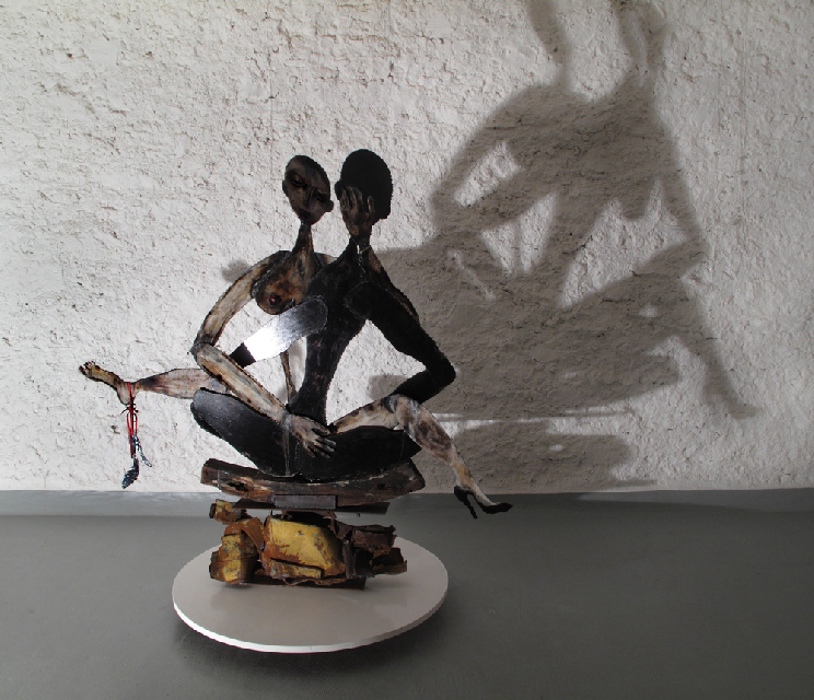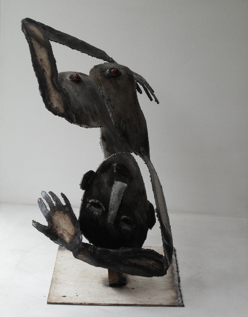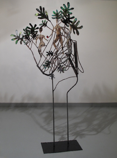 Présentation : Elle recueille chez un ferrailleur de Brest des métaux, fer et acier, qu'elle traite au chalumeau. Et ainsi elle redonne vie aux débris des défunts bateau. Elle en tire des figures auxquelles elle garde les lambeaux de couleur d'origine en y ajoutant d'autres de son cru et qu'elle vernit. Ces êtres tourmentés - ils sont passés par le feu - baroques, ouvrent de grandes orbites, dialoguent, Ainsi soit-il (2004) ou Mariage ciel et enfer se font des confidences, Confessions intimes (2008). Moins souvent, elle soude et crée des êtres en épaisseur de galette que l'on peut regarder recto et verso. Ses personnages filiformes, enfants d'art brut* de Giacometti*, prennent une branche comme tronc sur lequel s'agglomèrent jambes, bras et visage en fer ; placés en ronde, ils évoquent la danse nègre (2009). Tout comme les couples aux cheveux crépus (2010).