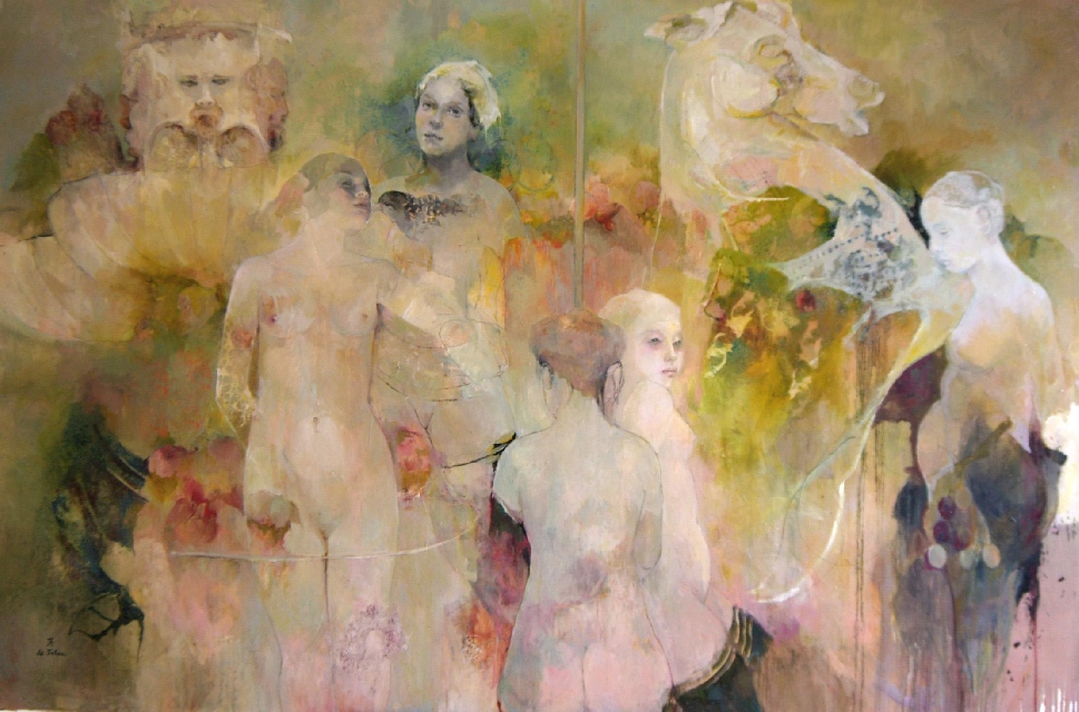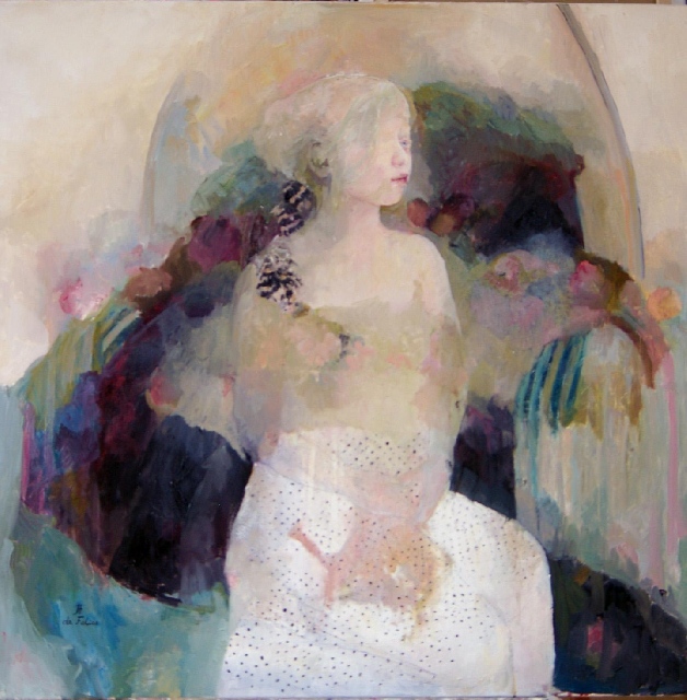 Présentation : Jusqu'en 1982, elle se glisse dans le moule du post-impressionnisme. Depuis, ce sont de grandes toiles peuplées de jeunes-filles évanescentes dont le visage au regard triste trouve ses limites dans des ombres colorées d'huiles diluées comme des aquarelles. Un jeune homme apparaît, un cheval, un masque, mais ce sont des antiques, Rêverie d'un cheval, (2007). Un monde féérique, dont le sujet s'estompe comme les couleurs pour laisser le vide au rêve qui parfois conduit à rejoindre Leonor Fini*.