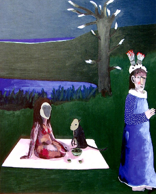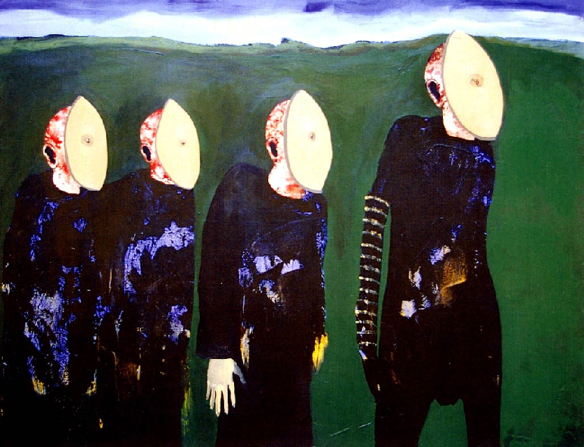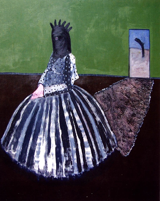 Présentation : Ses toiles relèvent à la fois de l'art brut*, de l'esprit vaudou et du folklore amérindien. Des figures privées de bras, d'autres animales, plates comme découpées dans le métal, se détachent sur un fond sobre, La lecture de l'oracle (2009), à genoux, un homme scrute la vulve d'une chèvre. Ses bustes de profil ont le visage brouillé par un lupus, Réfugié (2010), une file de personnages en pied, identiques, cachant leur visage derrière une mandorle qui leur sert de heaume, Le Cortège du chœur (2009). Il importe en France les phantasmes et les réalités du choc des cultures. Le Voyage de Spinder (2007), sur fond rempli de bandeaux de touches bleues verticales, annoncent la fin de la surcharge sur laquelle se dressent des totems tronqués et multicolores, La Conquista (2007), ou le viol par un grand blanc laiteux d'une indienne bleue, sur un fond rouge, uni. Il raconte des épisodes multiples en creusant un panneau de bois, et en le peignant partiellement en ocre orangé, ressortant sur la chair ligneuse brute, de sorte que le travail est bicolore, Hôtel de Ville (2005).