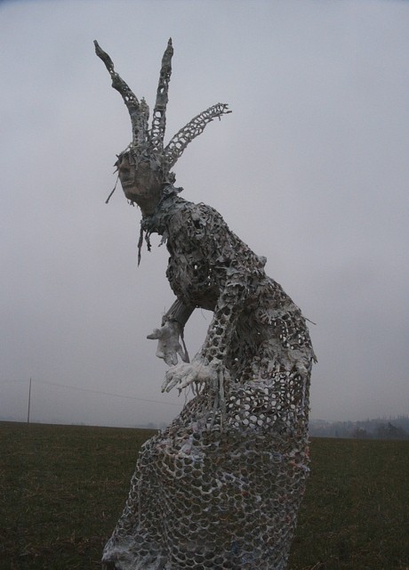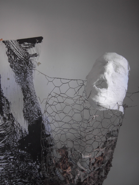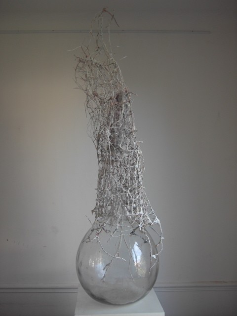 Présentation : Au papier mâché blanc sur fil de fer, il crée des figures entre l'humain et insectes en fin de métamorphose. Ils se dressent, acéphales, avec leurs antennes ballantes, devenues bras démesurés, issus d'une liaison entre Giacometti* et Germaine Richier*, bâtards ayant acquis leur autonomie ; ce sont Les Égarés (2009). Au-delà de ce monde gracile et réduit, il dresse des figures grandeur nature, filets drainant des Vanités ou personnage de carnaval à la coiffure tricorne et la folie, incliné en racoleur. Entre les deux dimensions, il revêt des dame-jeanne d'un dégoulis de pattes et de mains.