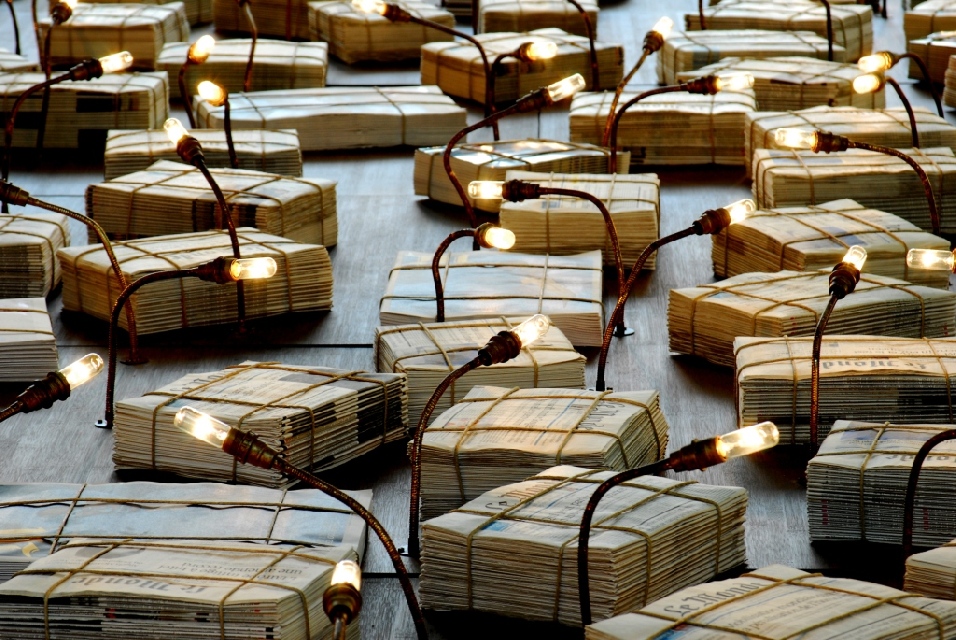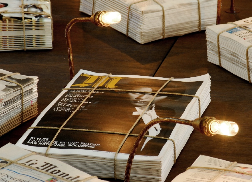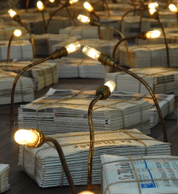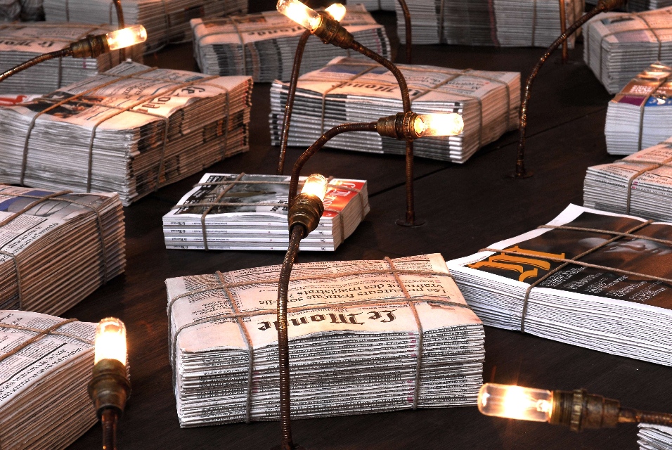 Présentation : Il exprime une vision du monde, celle-là même reflétée par Le Monde. Un étalage de briques de journaux ficelés, prêts à la livraison éclairés par des ampoules qui dégagent une faible lueur, celle qui nous reste ; en contrefort des têtes de journalistes progressivement couvertes de lettres de l'alphabet indiquent la prise de conscience de leur responsabilité ; elles sont posées sur des socles grillagés remplis de journaux froissés dont le message peut encore être perçu ; le titre s'impose Éclairer Le Monde. Auparavant Tous ensemble (2002), à la fois peinture, sculpture et installation, se présente comme une condamnation de la violence et de l'intolérance. Il conceptualise* de manière lumineuse.