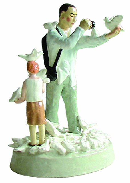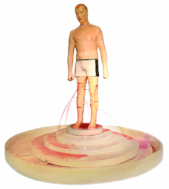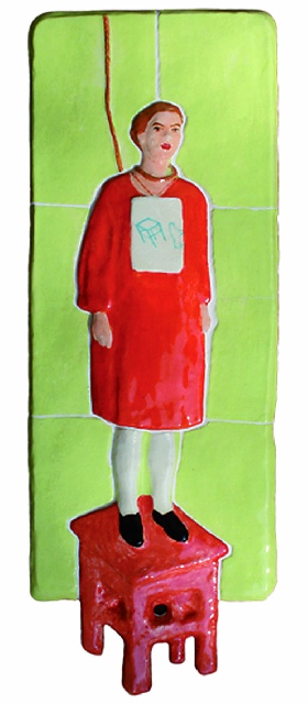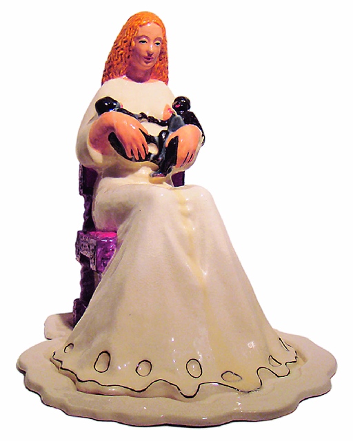 Présentation : Ses céramiques rose-bonbon, sont toutes des hommages. Elle saisit un détail significatif chez ses confrères morts ou vivants et l'insère dans une sculpture qui a la charme un peu kitsch d'un bibelot décoratif. Ainsi Valie Export (2008) exhibe son sexe ; Boris Mikhaïlov (2007), fait l'amour ; Vanessa Beecroft (2008) allaite deux bébés noirs. Cette dernière, comme d'autres, est animée en ce sens que le lait s'écoule de ses seins, comme le sang-vin rouge s'écoule des blessures d'actionnistes*. Photographe de la vieille égérie de la culture souterraine moscovite, elle la prend nue, épilée, devant un jeune à la faux prêt à trancher sa vie (ca. 2005).