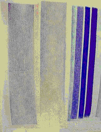 Présentation : Il lui reste de ses séjours dans des îles lointaines, le goût de l'Orient. La verticalité nervurée de ces bambous multicolores, les yeux clos sur l'intime de ces têtes et, depuis 2002, dans des compositions non-figuratives, des planches et des bandes sur un fond à dominante unique dans son dégradé.