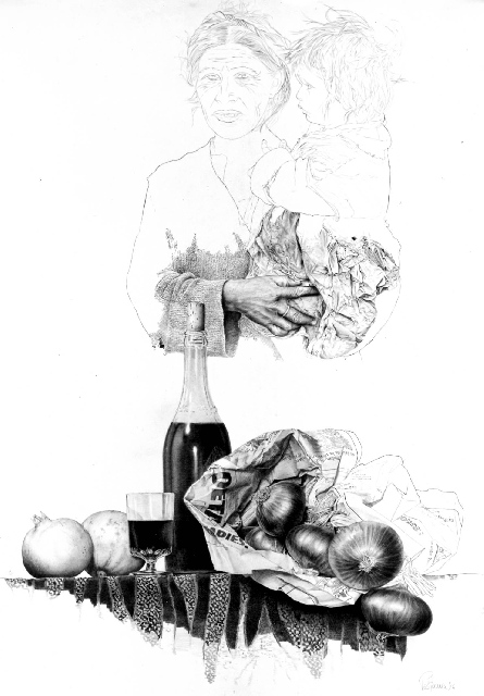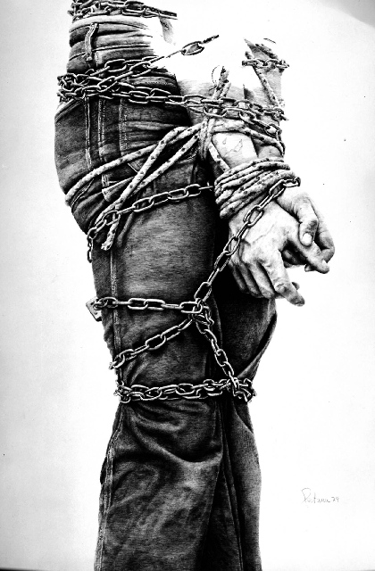 Présentation : Le photographe n'est pas seulement celui des grands noms de la littérature sud-américain de Borges à Varga-Llosa, il est également celui de la vie quotidienne des rues, son regard se portant par préférence sur les laissés pour compte de la société. Ce sont ses clichés qui l'amènent à devenir le dessinateur hyperréaliste* à la mine de plomb, sur bristol de 65 x 95 cm. choisissant des détails. Couples de jambes (1979), journaux froissés qu'on peut lire, au pied d'un torse enchaîné de saltimbanque (1979), figures vues de dos ou en raccourci (1980, 1985).