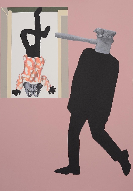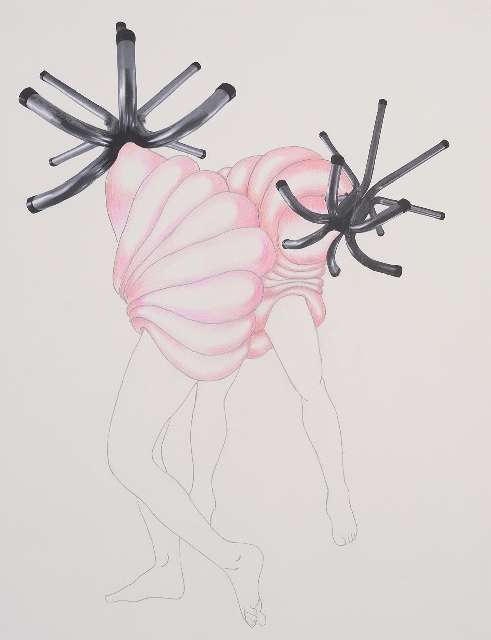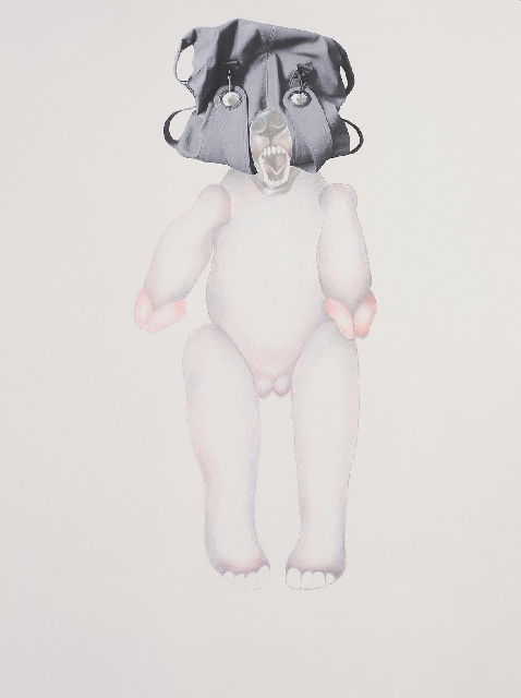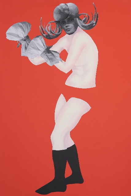 Présentation : Sur de grandes surfaces peintes et laissées nues, un collage de figure découpée prend place et de cette double simplicité, naît son style, accentué encore dans l'une de ses premières réalisations, La Boxeuse (2009), quant le slip se confond avec la couleur de l'arrière-plan, au point de couper en deux le personnage ; un dessin discret s'approprie le tout. Parce que le découpage est incisif, net, sans bavure, on sent la cruauté des ciseaux à l'œuvre. Ironie donc plus qu'humour dans ses rapprochements hasardeux des accessoires du sujet, le parapluie brandit par une centauresse dressée sur ses pattes arrières (2009). Plus modeste, un nounours, se trouve charcuté en bras phalliques, la tête prise dans un bagage à mains (2010).