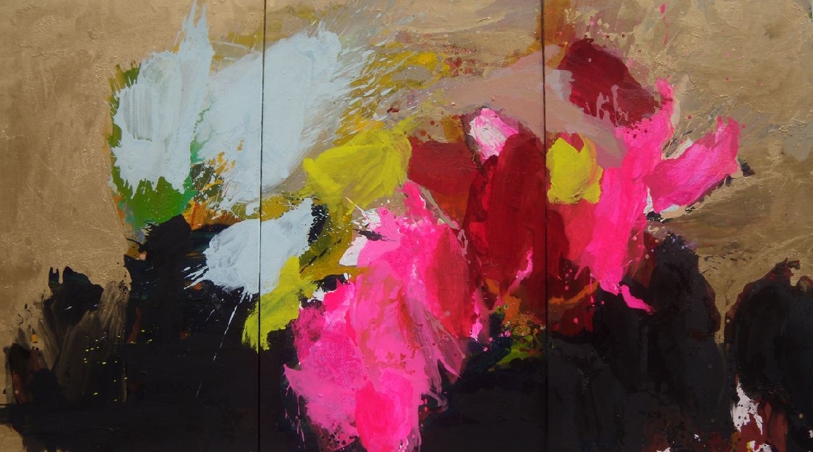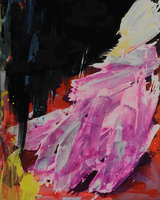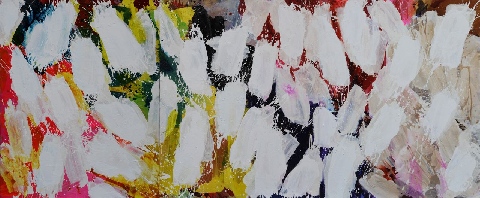 Présentation : Sur des toiles de plusieurs mètres de long, parfois en triptyque, elle se bat à la brosse pour bâtiment avec la couleur. Un geste fou qui rappelle les fureurs de Gutaï, blanc sur grège à discret fond doré. Chromatiste hors pair, elle déploie ses jets centrifuges sur des tondos, Les vagues se succèdent, l'améthyste couvrant le carmin, Instantané, n°2, (2008) et le blanc se heurtant au noir, L'inachevé, (2009) et ce carmin récurrent s'affrontant à l'or et au bleu pervenche, (2008). Dans Joy, (2009), la manière est quelque peu différente, une toile peinte probablement comme ses voisines ne montre plus guère qu'un semis d'oves blancs cassés de gris.
