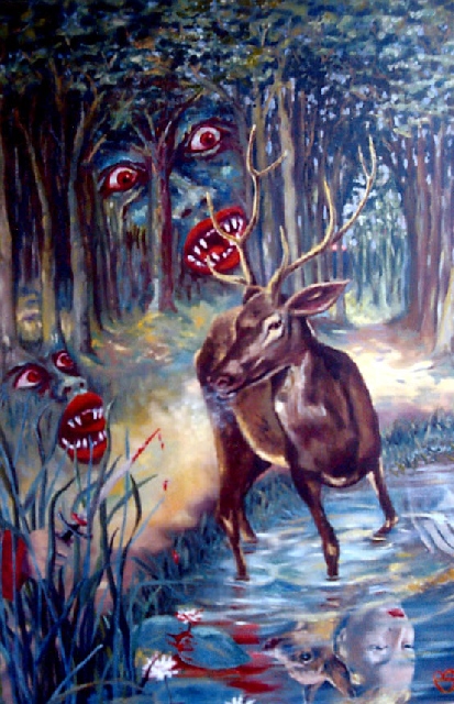 Présentation : Vingt-huit tableaux pour une carrière d'amateur, entre 1949 et 1952, pour une carrière d'amateur aussi talentueux fût-il, laissent à peine le temps pour asseoir un style ; c'est moins que la durée prise par les grands maîtres pour se trouver. Blondeau côtoie le post-impressionnisme, L'Angélus (1949) ou Saint Honorât (1952). Dans une facture académique sans défaut, Des terrils du Nord au soleil de la Rivera (1952), allégorie de son parcours, comme l'Appel du Large. A la manière d'un vitrail, célèbre Guynemer, (École d'officiers de Salon-de-Provence). La Chasse à courre (1952), condamnée par des monstres sous-bois. Son travail le plus accompli est sans doute La Folie entraînant aux horreurs de la guerre (1951), le guerrier à cheval sème le feu, au loin la ville brûle et la population éparpillée se porte au pied de Jésus en croix.