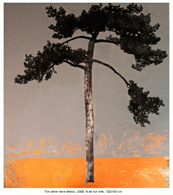 Présentation : Au début est la calligraphie. Puis vient l'huile. Des figures silhouettées, Homme à la tête de cheval, (1996) un nez, des yeux et pour la bouche, le néant et ainsi jusque Le Silence d'un enfant, (2005). A compter de 1994, un essai d’expressionnisme*, Image d'un cri, (1994), un crâne, presqu'une Vanité, dilué dans l'informalité ténébreuse. C'est la transition vers la non-figuration des taches et des zébrures, (2002), après la période des des fleurs, (1997, 2001). Soudain, volte-face, un travail figuratif dépouillé comme un jardin oriental. Des rectangles en aplat comme fond, à l'instar de paravents, un résineux, tronc dépouillé étend ses plus hautes branches, et pour mieux souligner l'inanimation, une chaise inoccupée ; on ressort de cette distante froideur, serein. Jardin d'Automne, (2007) ou Randonnée, (2011)..