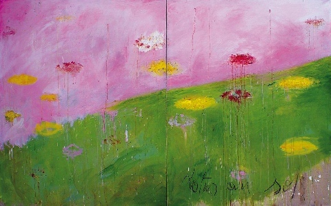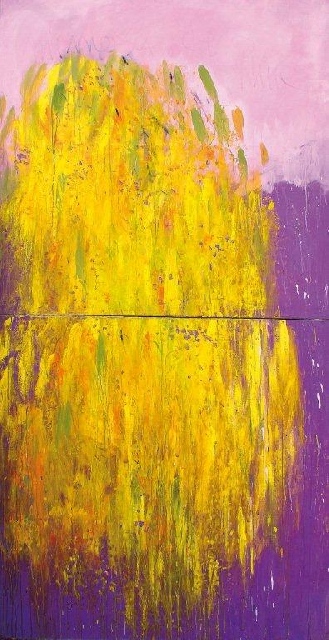 Présentation : Chromatiste la plupart du temps informelle. Le noir étant banni, elle use de couleur subtilement rapprochées, Après l'orage (2002), espaces ardents coupés d'un gris bleu. Elle adopte l'améthyste, Ouragan (2001), envahi par une nuée d'Ancien Testament ; gerbe de jaunes d'or sur fond améthyste, Mimosa de pluie (2006), Violettes (2008), isolées sur un terreau améthyste encore, ou un cœur, améthyste toujours, en suspension sur un carreau de salle de bains, Elsa (2005). Le bleu, le vert, le violet associés en plages qui se rencontrent, Paysage humide (2007), espaces mentaux dans lesquelles courent l'imaginaire et l'imagination.