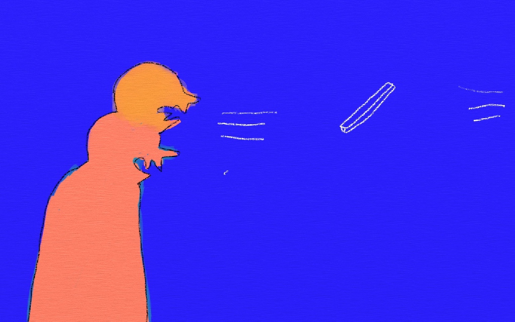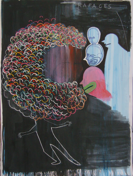 Présentation : Une tête d'homme perdu, coincé entre deux masses murales, au graphisme simplifié de caricaturiste dont seuls les yeux roulants disent l'angoisse existentielle (2010).