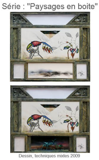 Il matérialise les insectes regardés dans quelque muséum et les transforme en créatures surréalistes aux antennes de fantaisie encadrées dans une boîte pour prolonger l'illusion, Paysage en boîte (2009).