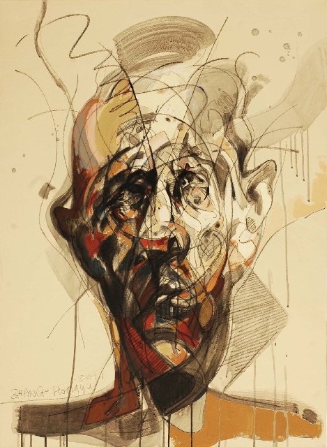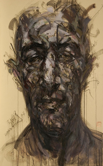 Présentation : Essentiellement portraitiste d'un même visage émacié, vue de face, le nez proéminent, capté par des coups de pinceau nerveux  à l'acrylique noir ; sur cette face, il déroule une pelote de traits noirs et parsème des gouttelettes comme une transgression par regret, N° 36, (2012).