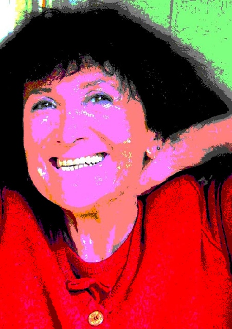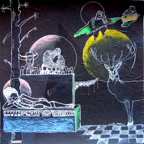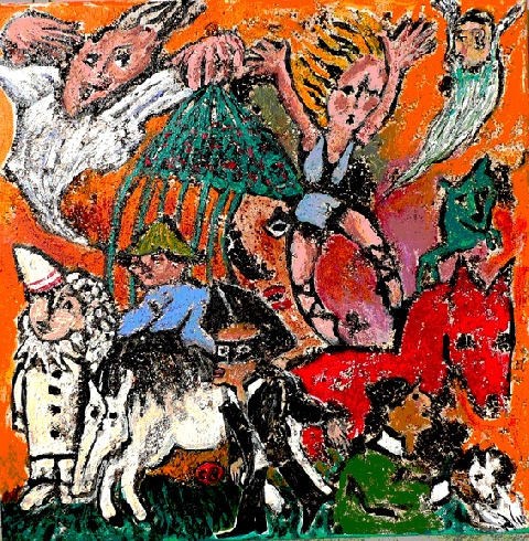 Présentation : Travaille en pleine pâte chamarrée. Son bestiaire alterne sur même échelle et même plan avec des figures. On est en plein dans le monde des contes et légendes. Mais aussi dans celui de la peinture, dont elle a le sens. Les couleurs vives, orange, rouge, bleu - jamais de noir ou si discrètement - chantent. Entre ses sujets animaux et humains, l'espace est rempli, chaque section est traitée par des motifs propres, rayures, carreaux, traits, petits orthogones, et assure le lien et l'unité de l'ensemble.