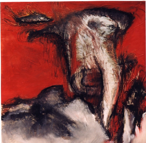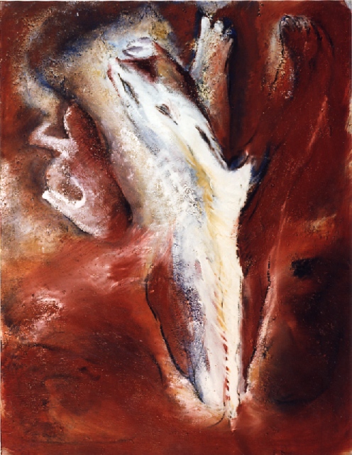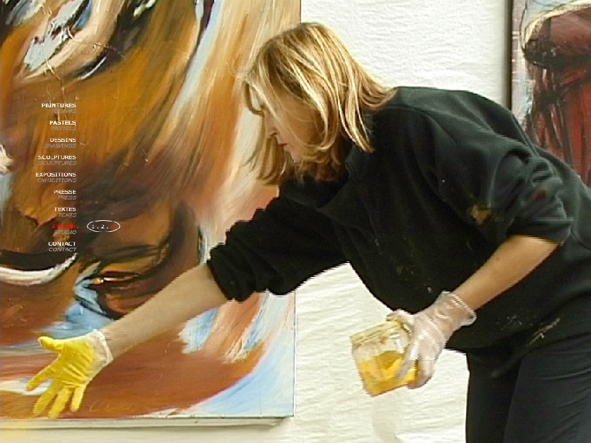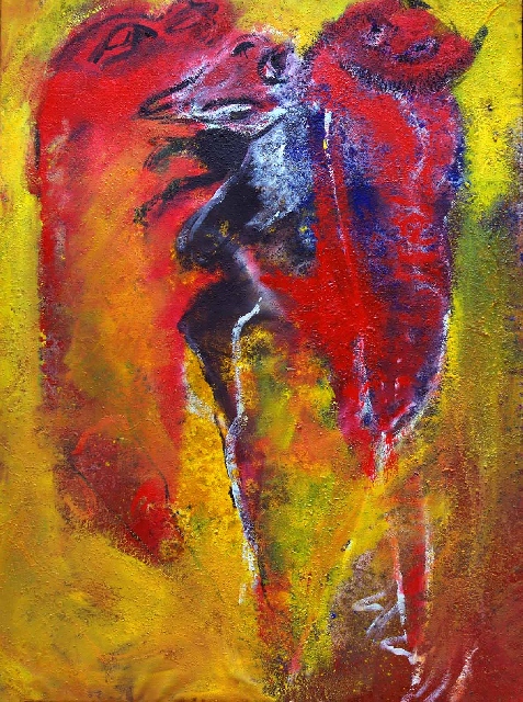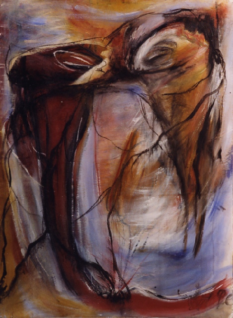 Présentation : Une abstraction forte, lumineuse et complexe obtenue par une technique originale. Elle enduit d'acrylique une toile au sol,  préparée dans un beige pâle et elle y jette des pigments. Redressant la toile sur chevalet, elle travaille alors à l'huile et au pinceau, et les pigments originaux laissent une surface grumeleuse. A partir de là, la forme expressionniste* est à décrypter ; d'autant qu'il y a superposition des contours, amples, généraux, noirs et/ou de couleur ; la  réalité animale, humaine, zodiacale se fond, la réalité se dissout  dans une flamboyance mouvante d'un chromatisme recherché, ocres, beige, bruns et des bleus, du lappis-lazuli à l'azérite et des jaunes de blés mûrs côtoyant les pourpres. De petits pastels sont comme un détail unique venu des grandes toiles.